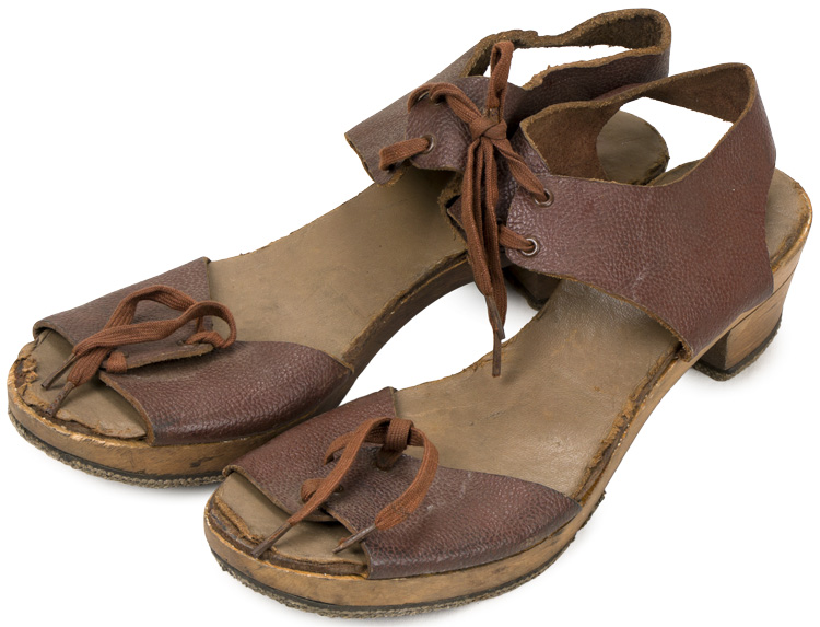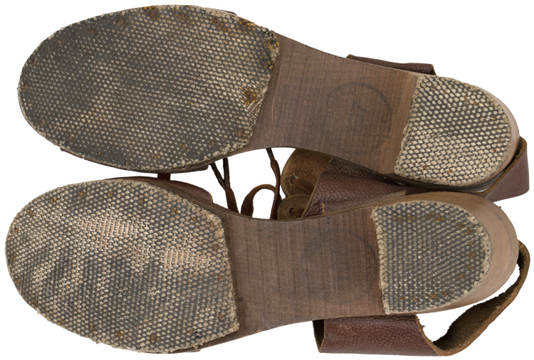 A pair of wood and leather sandals with a 4cm tall heel and a 24cm or 9.5" long foot. The sandals show wear, but do not appear to have been issued.