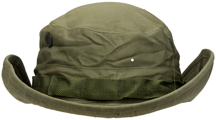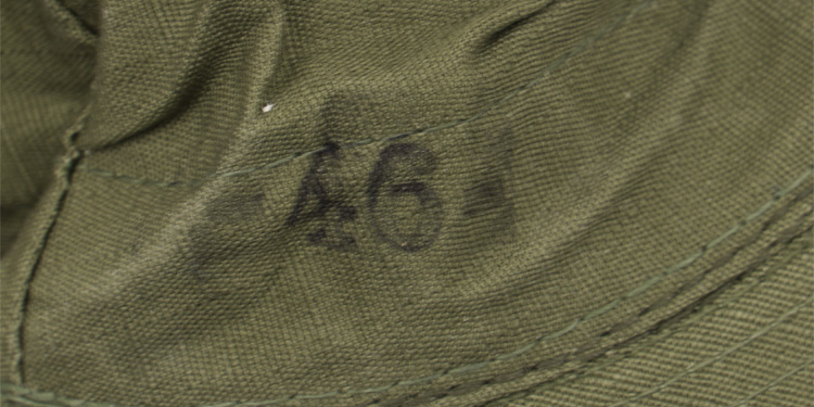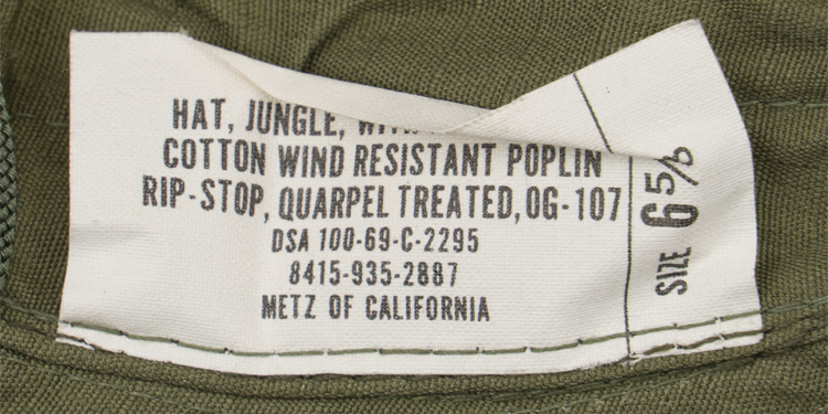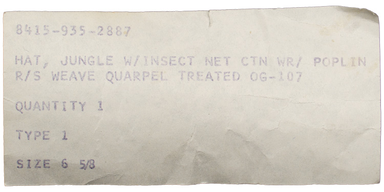 An OG-107 jungle hat with netting that bears a 1969 contract date. A typewritten piece of paper that accompanies the hat indicates that the hat is size 6 5/8. Pristine.