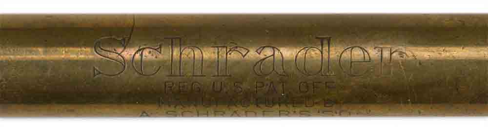A brass constructed tire gauge that is engraved "Schrader" "Manufactured by A. Schrader’s Son" of "Brooklyn N.Y." The surface shows moderate surface scratches, wear and age, but overall a very nice example.
