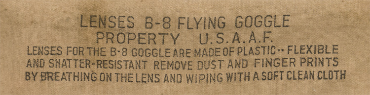 A cloth case with seven pairs of original extra lenses (four polaroid green, one polaroid amber and two polaroid clear). All are separated by paper cutouts resembling the lenses. To the outside flap, stamped in ink, is "Lenses B-8 Flying Goggle Property U.S.A.A.F." along with how to care and clean for the lenses. There is also a small circular stamp to the front. The lenses are in excellent condition with the case seeing moderate usage and aging. The cloth case measures approximately 21cm x 9cm.