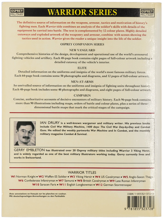 A 18.5cm x 25cm softcover book written by Ian Drury with colour plates by Gerry Embleton as part of the Warrior Series issue 12. Published by Osprey Military as a preprint 2000. The book consists of 64 pages.