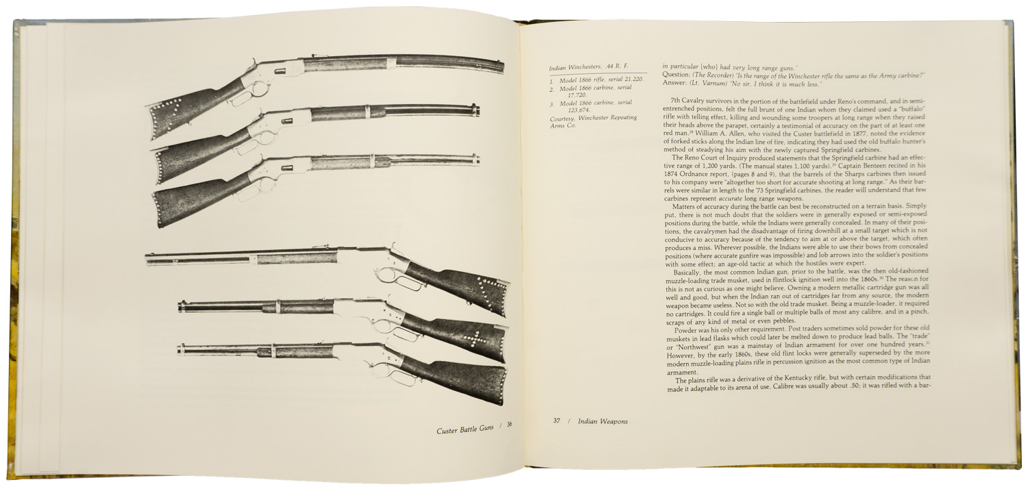 Custer Battle Guns by John S. DuMont. This is the classic work on the subject of weapons used be Custer’s 7th Cavalry and the American Indian during the Big Horn Battle of 1876 . The information is a wonderful in-depth study that is still the go too book on this subject. Hardcover, 24cm x 26cm, 106 pages.
