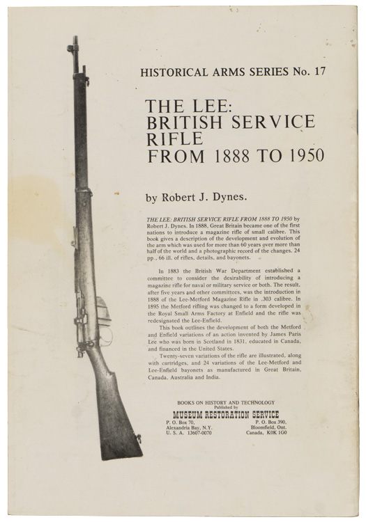 A 6 7/8" x 10", softcover, thirty-two page booklet addressing the sniper rifles used by the United States, Britain, Canada, Russia, Germany and Japan in both the First and Second World Wars. Twenty-four rifles, and their telescopic sights, are presented in black and white photographs, among other images which accompany the text. Moderate soiling and water wrinkling is evident to the covers, and a couple of the pages have minor tears where they had been separated after having been stuck together. By William H. Tantum, IV, published by Museum Restoration Service as the eighth in their "Historical Arms Series," sixth printing, 1992.