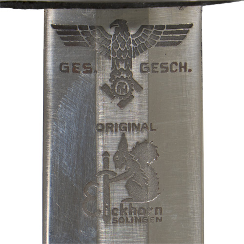 PHYSICAL DESCRIPTION: This TeNo Leaders dagger in excellent condition. The cross guard features the special eagle being a Paul Casberg design. The eagle is stylized, having open wings and clutching a double lined swastika having decorative lines in the legs and a superimposed gearwheel enclosing the letters "T N", with the "T" letter being in the shape of a mining hammer. The grip in yellow celluloid. The grip is in perfect condition. Wrapped about the grip is the original to the piece 23cms portepee. The scabbard is straight throughout. It has fine pebbling to the panels on both sides. The throat is retained by a single flatter head screw positioned in the center of the reverse upper scabbard. The throat is stamped with the number #2897. Excellent TeNo blade. The obverse ricasso of the blade is matching stamped (not etched), and the stamping runs vertically, toward the tip, as we see only on early examples. The matching stamping is "2897". The reverse ricasso is dark etched with the TeNo eagle grasping a swastika together with the gearwheel and "TN" initial. On either side of the TeNo eagle are the patent pending words, "Ges. Gesch". The original blade washer is present. Superb example.