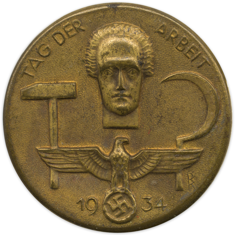 PHYSICAL DESCRIPTION: A 35mm diameter, hollow struck, bronzed alloy badge featuring a male bust figure above the national eagle and swastika, with "19" and "34" to either side of the swastika, and a hammer to the left with a sickle to the right. The implements represent farm and industry. "Tag der Arbeit" (Day of Labor) arches along the top. The initials "RK," no doubt the designer’s, may be seen alongside the base of the sickle. A horizontal pin-back device is soldered to its reverse. Maker marked.