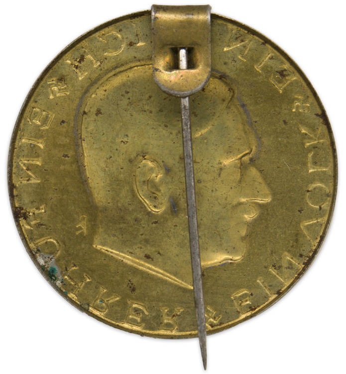 A 28mm diameter, stamped brass badge with Hitler’s profiled, disembodied head to its center, around which is scrolled "Ein Volk, " "Ein Reich," and "Ein Führer" (One People, One Nation, One Leader) separated by small, mobile swastikas. To the reverse, a 25mm metal pin is crimped into a folded-over tab descending from the top.