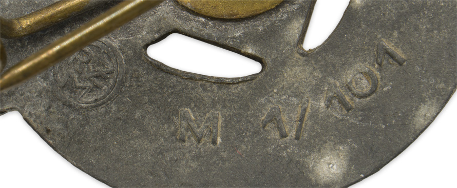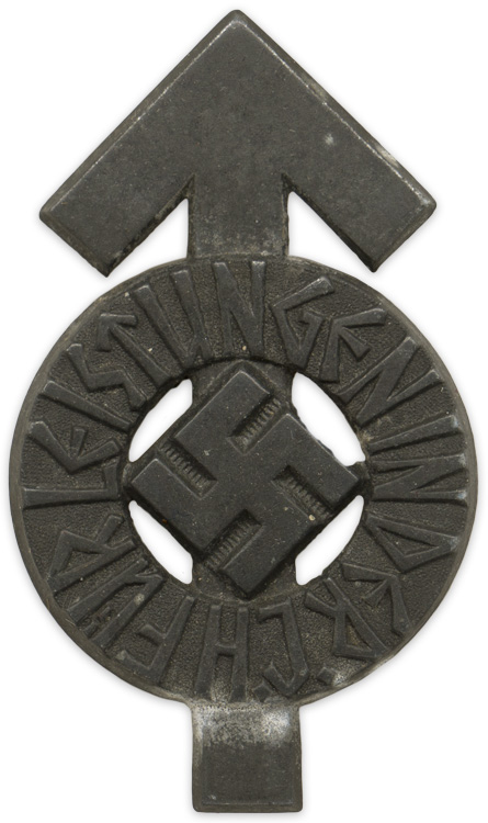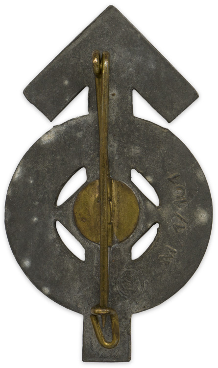 PHYSICAL DESCRIPTION: The stamped alloy award is in the form of a Tyr-rune with a circle superimposed to it, upon which is embossed, in runic script, "Für Leistungen In Der H.J." (For Proficiency In The H.J.), encompassing a mobile swastika. The solid reverse is well marked with the embossed RZM logo with dual circular borders and embossed manufacturers code, "M1/101" indicating manufacture by Gustav Brehmer, Markneukirchen. Complete with original pinback device.