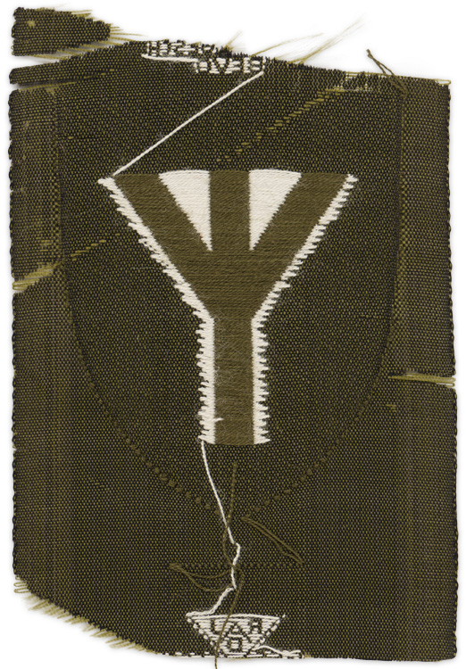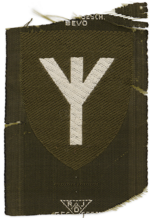PHYSICAL DESCRIPTION: A 40mm x50mm machine woven earth brown shield, within which is a white "Lebensrune" (Life-rune). This specialty insignia, worn on the lower left sleeve of the RAD uniform, signified that the wearer was a member of the health service, and had replaced, in 1937, the earlier caduceus. Above the shield is machine woven, in white, "RADJ" within an inverted triangle, with "Ges." and "Gesch.," for "Gesetzlich Geschützt" (By-law Protected), to either side of it, and "BeVo" beneath it. Scarce.