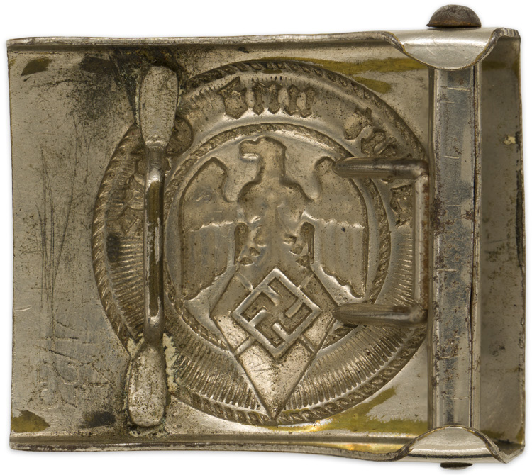 PHYSICAL DESCRIPTION: The standard, cast alloy, silver washed zinc alloy, HJ buckle, as introduced in 1933, featuring an embossed HJ eagle and diamond to its lightly pebbled center, encompassed by a dual rope-like border within which, against a ribbed background, is the embossed Gothic script, "Blut und Ehre" (Blood and Honor). Reverse of buckle with embossed RZM logo and "M4/23" for Frank & Co Lüdenscheid.
