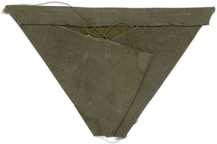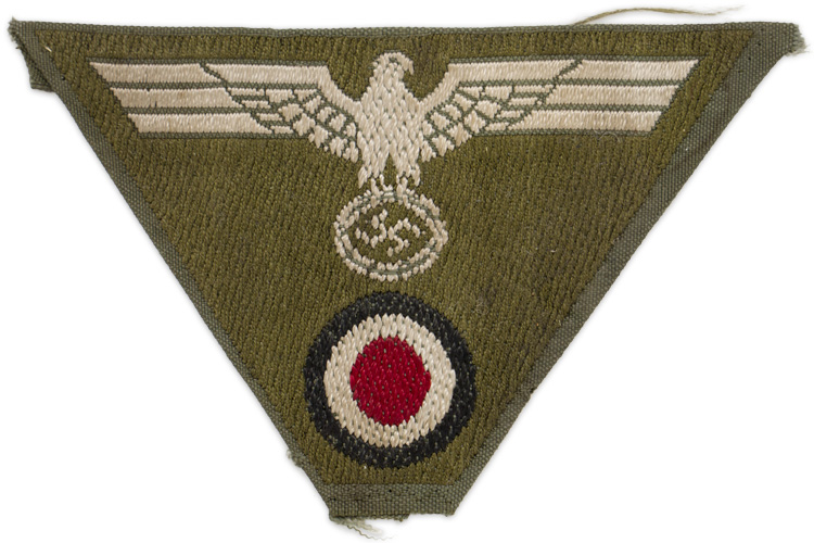 PHYSICAL DESCRIPTION: Machine woven national eagle with outstretched wings, clutching a wreathed, canted, swastika in its talons, in matte grey, rayon threads, positioned above a national tri-color cockade with a black outer circle encompassing a white inner circle and a red center dot, on a cut-out, woven, field-grey rayon trapezoidal base. The trapezoidal base is roughly, 45mm tall and 55 wide at the top edge tapering down to 15mm wide at the bottom edge and the eagle’s wingspan is roughly, 50mm from wing tip to wing tip.