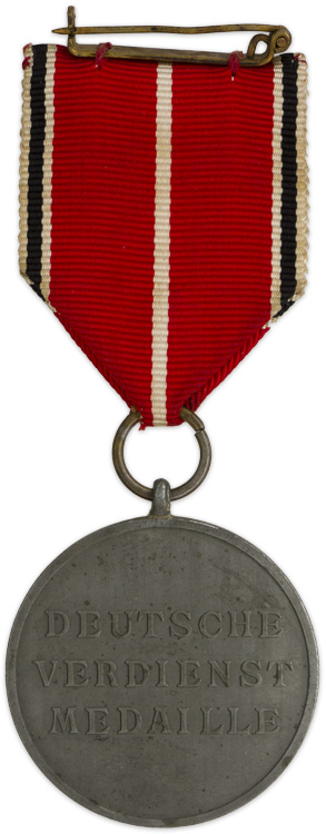 PHYSICAL DESCRIPTION: 1943 pattern. Roughly 39mm diameter, die struck zinc/alloy award. The obverse of the award features an embossed Maltese style cross with national eagles, with downs wept wings, clutching a canted, wreathed swastika, between the cross's arms on a smooth background field with a raised outer edge. The reverse has embossed script "Deutsche Verdienst-Medaille", (German Merit-Medal), on a smooth background field with a raised outer edge. Complete with original ribbon and pin back device.