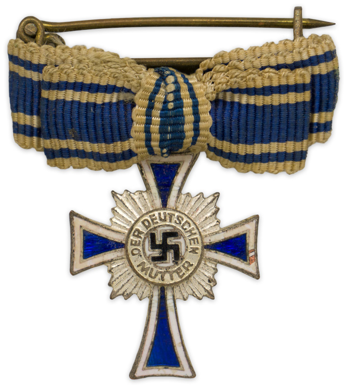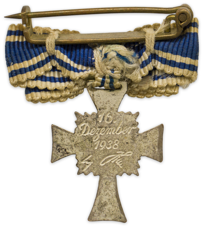 PHYSICAL DESCRIPTION: A 23mm tall, 17mm wide, miniature version of the second pattern award with a silver wash and blue and white enamel work with original. The award is in the form of a Christian cross in blue enamel with a white enamel border, both outlined in silver. Between each arm of the cross are five-ray projections in silver. The central circular field has a white enamel base upon which is a black static swastika, outlined in silver, and encompassed by a silver surround with the embossed Latin script, "Der Deutschen Mutter" (The German Mother). It comes with the original ribbed rayon blue and white striped ribbon, formed into an ornate bow with original pin back. The reverse has the stamped simulated handwritten script, "16 Dezember 1938," and a facsimile of Hitler’s signature