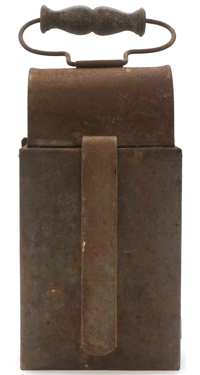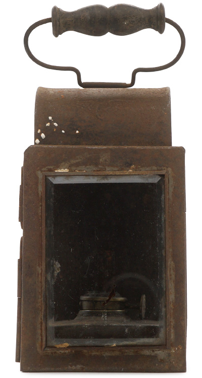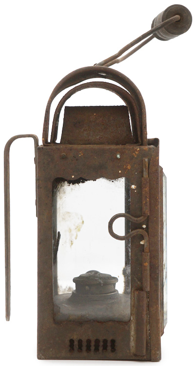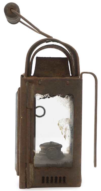PHYSICAL DESCRIPTION: A tin lantern measuring approximately 17cm x 9.5cm x 7cm that is complete with original clear glass and original wire and wood handle. Embossed to the hood is a wheel with wings extending horizontally from either side. The lantern shows heavy usage, wear and oxidation. The tank is present, but the mirror is missing. Also present is the bent "belt hook" to the reverse panel.
