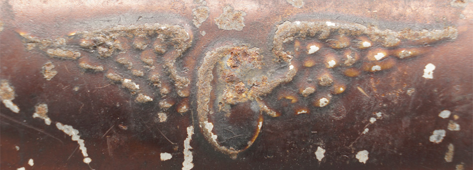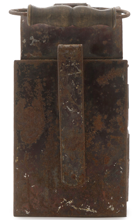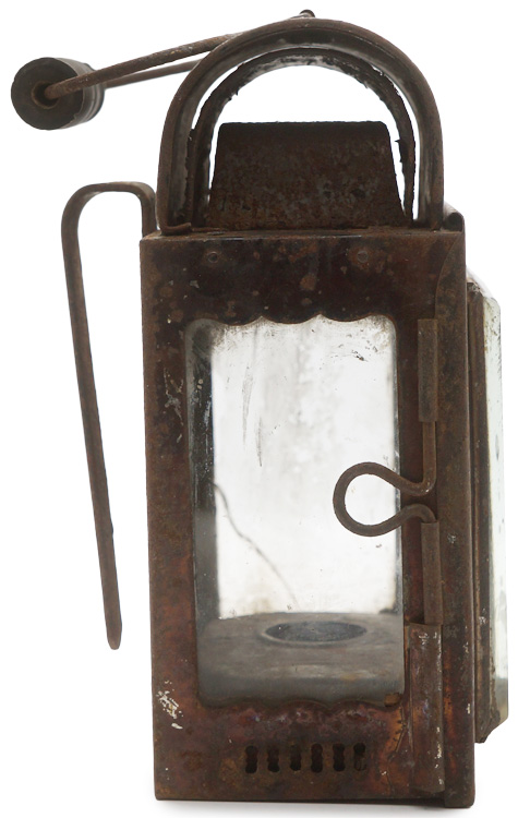 PHYSICAL DESCRIPTION: A tin lantern measuring approximately 17cm x 9.5cm x 7cm that is complete with original clear glass and original wire and wood handle. Embossed to the hood is a wheel with wings extending horizontally from either side. The lantern shows heavy usage, wear and oxidation, as well as glass wear and a crack to the right facing side panel. The tank is present, but the mirror is missing. Also present is the bent "belt hook" to the reverse panel.