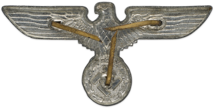 PHYSICAL DESCRIPTION: A 1939 pattern, stamped natural alloy eagle, with a wing span of 65mm, who clutches a wreathed, mobile swastika in its talons. To its hollow-backed reverse are fixed three attachment prongs. Faint makers mark to the reverse. Nice clean example..