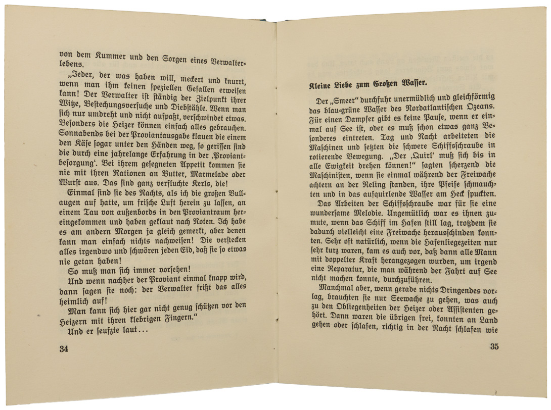 A 13.5cm x 18.5, 96 page hardcover book whose title loosely translates to "Sea Comrades". It was written by Karl Költer. Book for German youth promoting life at sea. Wonderful color artwork. Published by Loewes Verlag Ferdinand Karl, Stuttgart 1936.