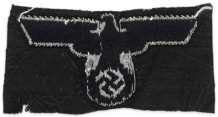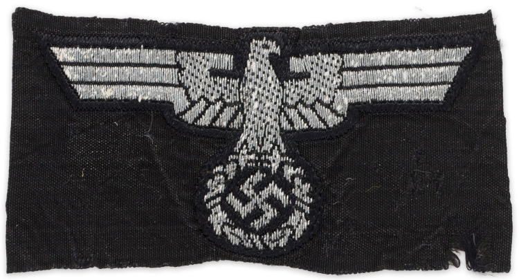 PHYSICAL DESCRIPTION: A machine woven Transport group "Speer" eagle and swastika all in silver/aluminum thread with black accents, on its original, black factory roll. Wingspan is 55mm. Scarce.