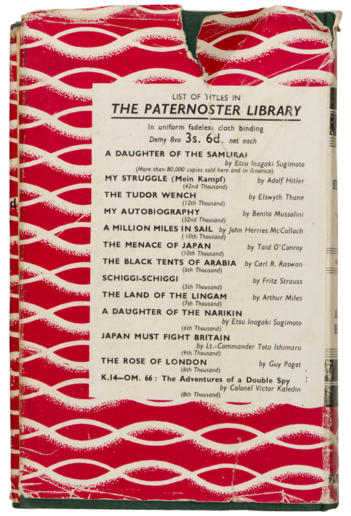 An English version, 14cm x 22cm hardcover book with colour book cover. The book was published by the Paternoster Library (Hurst & Blackett Ltd) as a "Cheap Edition" in March 1938 and consists of 285 pages. The cover shows moderate/heavy usage and wear with evident tearing. Rare to see in this pre-war English edition.