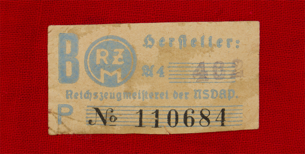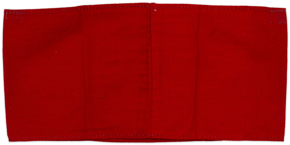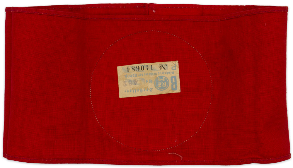 PHYSICAL DESCRIPTION: The approximately 10cm x 45cm red cotton armband has a 9cm diameter white field sewn to it, upon which is the SA sports badge machine woven in copper-colored threads. The SA sports badge is in the form of an upright short sword against a mobile swastika surrounded by an oak leaf wreath. Complete with original RZM tag. Couple of small stains.