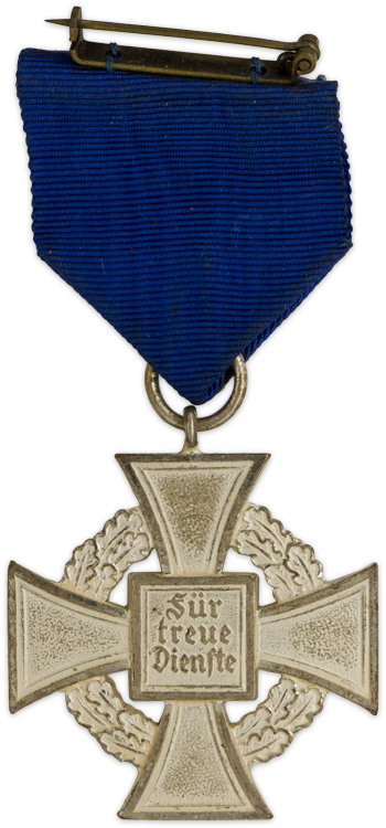 PHYSICAL DESCRIPTION: A second class, die struck alloy decoration with nickel-silver plated highlights, a frosted white finish and a black enamel swastika. The decoration is in the form of a cross Pattée with a circular oak-leaf wreath extending between the arms of the cross. The center of the cross has a square plate with a black enameled static swastika to the obverse, and the embossed Gothic script to the reverse, "Für treue Dienste" (For Loyal Service). The arms of the cross have a slightly textured background field with a smooth, dual stepped, raised outer edge. Complete with original ribbon with pin-back device.