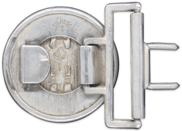 PHYSICAL DESCRIPTION: Roughly, 50mm diameter, stamped aluminum buckle with a silver wash. Face plate features an embossed second pattern DRK national eagle with down swept wings, clutching a cross in its talons with an embossed swastika to breast on a raised pebbled field. Outer edge of buckle with a slight recess with embossed, circular laurel leave wreath. Reverse with crimped outer edge and stamped out buckle catch and prong retaining clip. Reverse well marked with impressed script, "Ges. Gesch." for Gesetzlich Geschützt (Patented Pending), and manufacturers number, "1". Catch rectangular prong retaining bar and prongs all intact.