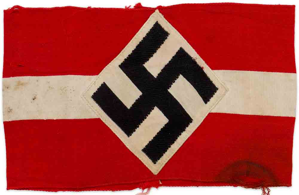 PHYSICAL DESCRIPTION: A later production, three-piece construction, red rayon armband. The armband has a central white horizontal stripe, with a white diamond and a machine woven construction black mobile swastika.