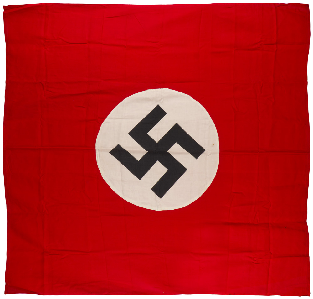 PHYSICAL DESCRIPTION: Multi-piece cotton construction banner approximately 135cm x 150cm. To both its red fields are sewn white disks, with a printed mobile swastikas in black. Fairly clean condition showing light age.