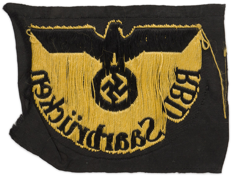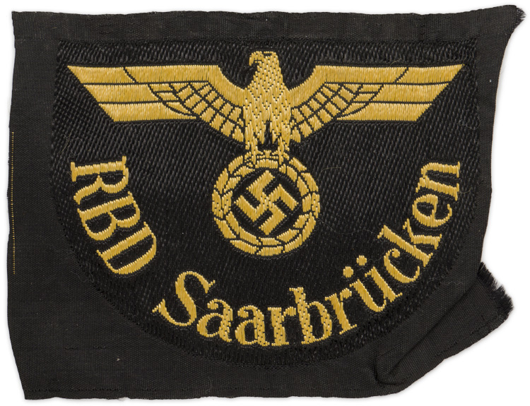 PHYSICAL DESCRIPTION: A machine woven, right facing eagle with outstretched wings and a wreathed, mobile swastika in its talons, positioned above the arching script, "RBD Saarbrücken." All of the threads are bright golden-yellow, against a half-moon shaped, woven black base, which is still on its section of black rayon factory roll. The insignia indicates service with the "Saarbrücken" division of the "Reichsbahndirektion."