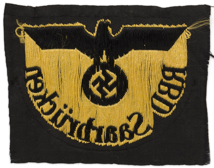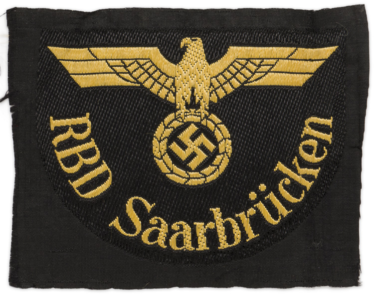 PHYSICAL DESCRIPTION: A machine woven, right facing eagle with outstretched wings and a wreathed, mobile swastika in its talons, positioned above the arching script, "RBD Saarbrücken." All of the threads are bright golden-yellow, against a half-moon shaped, woven black base, which is still on its section of black rayon factory roll. The insignia indicates service with the "Saarbrücken" division of the "Reichsbahndirektion."