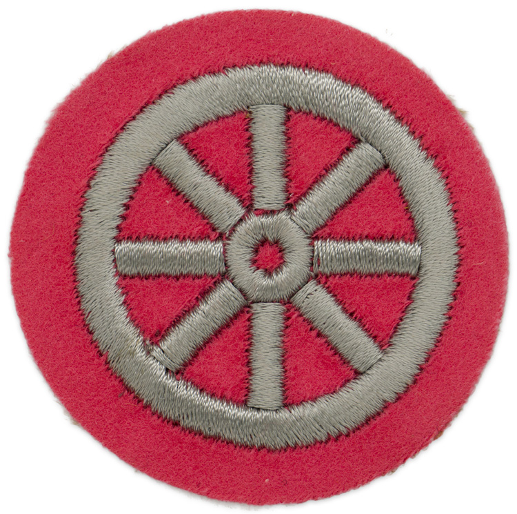 PHYSICAL DESCRIPTION: Roughly 45mm diameter, pink wool construction badge with a machine embroidered, eight spoke steering wheel in silver/grey threads to the center. The reverse of the badge has a ribbed tan cotton twill backing. Original RZM/HJ tag with red printed script is complete.