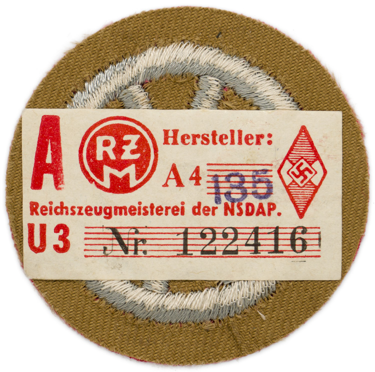 (HJ-Prüfung Abzeichen)BACKGROUND: Established in early 1933 in cooperation with the NSKK, National Sozialistische Kraftfahr Korps, (National Socialist Motor Corps), the Motor-HJ was the earliest, and largest specialty section of the Hitler Jugend. The age entry level for the Motor-HJ was fifteen years old and the first year was spent on driving theory and practical mechanic training until the member reached sixteen years old and was eligible to qualify for his drivers license. The Motor-HJ established the Motor Qualification Badge in three classes of A, B, and C with each subsequent class being more complex and detailed then its predecessor. The class A badge was the lowest of the three and the qualification for award was divided into four sub-categories consisting of knowledge of driving, vehicle repair, laws and road signs and driving proficiency. The badge was worn on the lower left sleeve of the brown shirt and service tunic.