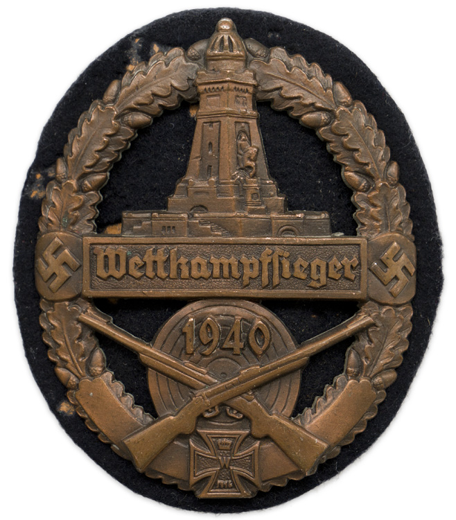 PHYSICAL DESCRIPTION: Very attractive award. Takes the for of the Kyffhäuserbund monument encompassed by an Oakleaf wreath. Directly below the monument is the inscription "Wettkampfsieger". Below that are cross rifles, a shooting target with the date "1940" and 1914 Iron Cross First Class. Badge is a die struck alloy with a bronze wash, slightly convexed shaped for attachment to the sleeve. Badge is attached to its original two piece black wool backing material (some mothing). Superb details, scarce.