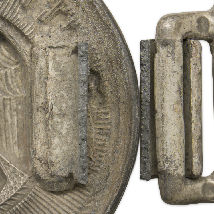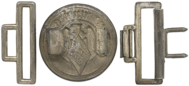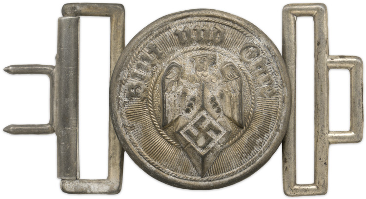 PHYSICAL DESCRIPTION: 1936 pattern, die stamped, three piece, zinc construction buckle. The circular belt buckle features a highly embossed HJ style national eagle clutching the HJ diamond to the center on a slightly pebbled background field. The eagle is encompassed by a circular, ribbed background border with simulated twisted rope trim to both the inner and outer edges. The ribbed border has a highly embossed, Gothic script, HJ motto to the top, "Blut und Ehre", (Blood and Honor). Prong bar has broken off, but all the parts are there. The reverse of the buckle is also well marked with an impressed RZM logo with single circular border and manufacturers code, "M4/22" indicating manufacture by Christian Theodor Dicke Lüdenscheid.