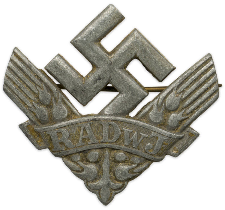 PHYSICAL DESCRIPTION: Stamped, solid backed, alloy badge, features a central canted swastika flanked by diagonally angled sheaves of wheat with a superimposed banner with embossed initials, "RADwj", to the bottom. The badge shows nice detailing including cut outs to the arms of the swastika. The reverse has a small soldered hinge a round horizontal pin and catch. The RADwJ War Helper’s Service badge was worn on the left lapel by all eligible personnel.