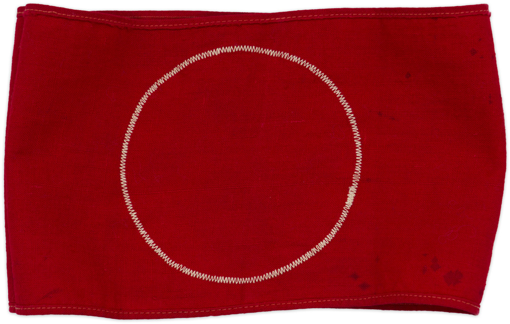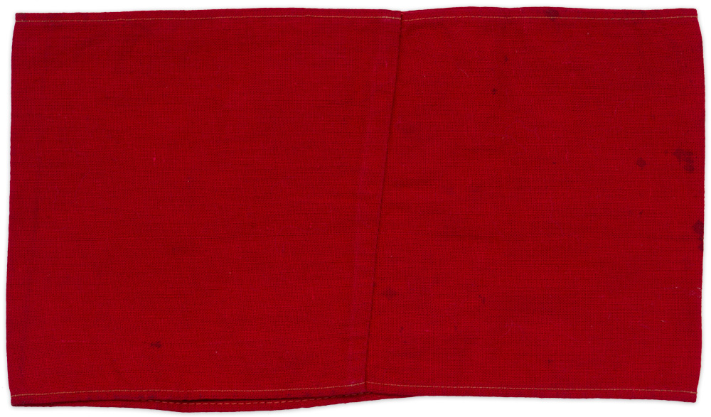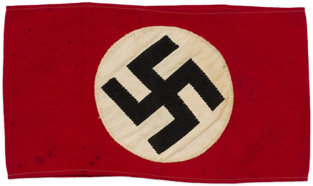 PHYSICAL DESCRIPTION: A red cotton armband, upon which is sewn an approximately 9cm diameter white disk, with a black machine woven mobile swastika.