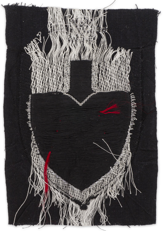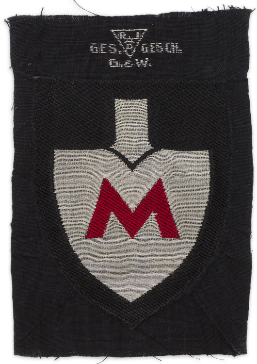 PHYSICAL DESCRIPTION: A 65mm x 85mm black rayon base to a machine woven black shield, upon which is woven an inverted silver spade head, with the letter "M", in red. The use of a black, rather than an earth-brown, shield indicates that the insignia was worn between August of 1933 and April of 1941. The silver, rather than white, coloration of the spade head indicates that it was worn by a commissioned rank. This arm shield would have been worn on the left upper arm of the uniform. Scarce.