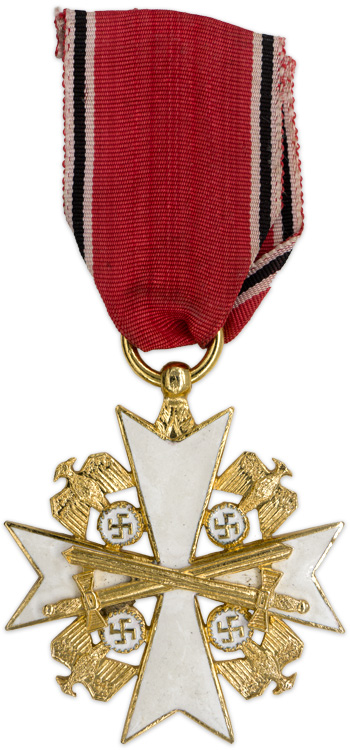 PHYSICAL DESCRIPTION: Spanish production, roughly, 1 3/4", (4.4 cm) square. Maltese style cross with white enamel work and gilt washed finish. The cross features a national eagle with down swept wings, clutching a wreathed, canted, swastika on a white enamel background field, situated between each of the cross’s arms. The arms of the cross are finished in white enamel with a fine outer edge stripe and small, "v" indentations to the ends of each arm. Mounted to the obverse, center, of the cross are two, gilt washed, stamped alloy, crossed swords. The addition of the crossed swords indicate it was issued for distinguished military merit. Complete with original ribbon. Not the same quality of the German made examples, but still a nice original variant.