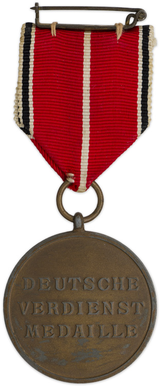 PHYSICAL DESCRIPTION: 1943 pattern. Roughly 39mm diameter, die struck bronze/tombac award. The obverse of the award features an embossed Maltese style cross with national eagles, with downs wept wings, clutching a canted, wreathed swastika, between the cross's arms on a smooth background field with a raised outer edge. The reverse has embossed script "Deutsche Verdienst Medaille", (German Merit Medal), on a smooth background field with a raised outer edge. Complete with original ribbon and pin back device.