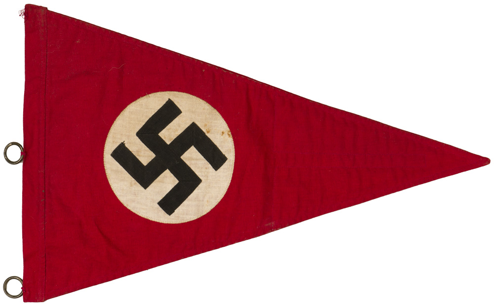 PHYSICAL DESCRIPTION: Roughly 24cm tall, 38cm long, horizontally, triangular, two sided, multi-piece construction pennant. The pennant features a red base field with a central white circular disk with a canted black swastika to its center. Two attachment rings remain.