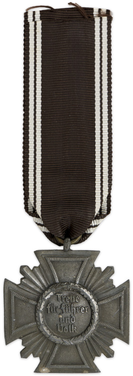 PHYSICAL DESCRIPTION: Third class, two piece, die struck zinc award in the form of a cross Pattée with a central circular centerpiece and sun burst patterned rays extending out between the arms of the cross. The separate, obverse centerpiece features an embossed national eagle encompassed by an oak leaf wreath on a slightly pebbled background field. The reverse centerpiece features embossed Gothic script, "Treue für Führer und Volk", (Loyalty to Leader and People), also encompassed by an oak leaf wreath on a slightly pebbled background field. The arms of the cross feature smooth, dual stepped, outer borders with an embossed ribbed inner border and slightly pebbled fields. The ribbon ring and suspension loop are both intact. The award comes complete with two pieces of original brown ribbed rayon moire ribbon with two white outer edge stripes.