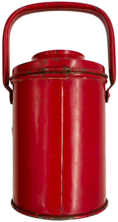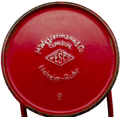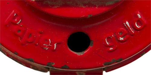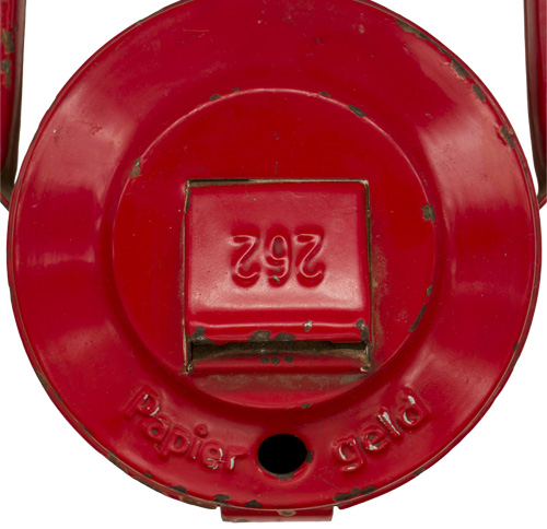 PHYSICAL DESCRIPTION: A red-painted, sheet metal can, roughly 17cm in overall height, and 10.5cm in diameter. A hinged lid is to its top, which is stepped as it ascends, with an angled coin slot to its apex. The lid has, immediately above its hinge, a small, circular perforation, with "Papier" (Paper) embossed to one side of it and "Geld" (Money) to the other. A handle is riveted to the reverse, beneath the lid’s hinge. To its bottom is the embossed maker’s name, "M. Westermann & Co," with "G.m.b.H." underneath it, for "Gesellschaft mit beschränkter Haftung" (Company with limited Liability), both arching above "Wesco" within a diamond, and with "Neheim -Ruhr" arching beneath that. The embossed number "8" may be seen below the latter location.