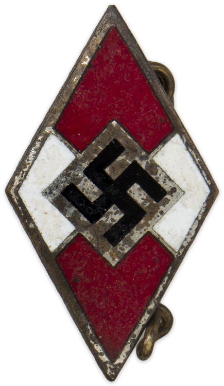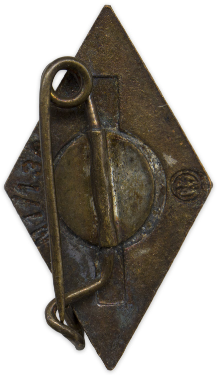 BACKGROUND: The origins of the Hitler Jugend, (Hitler Youth), may be traced back to March 1922 with the formation of the Jugendbund der NSDAP, Nationalsozialistische Deutsche Arbeiterpartei, (Youth League of the National Socialist German Worker’s Party), under control of the SA, Sturmabteilung, (Storm/Assault Detachment). In April 1924 the Jugendbund der NSDAP was renamed Grossdeutsche Jugendbewegung (Greater German Youth Movement), and on July 4TH 1926 the Grossdeutsche Jugendbewegung was officially renamed Hitler Jugend Bund der deutschen Arbeiterjugend, (Hitler Youth League of German Worker Youth). The first HJ membership badge was a round cap badge introduced in 1929. In 1933 a second pattern HJ membership badge was introduced and utilized through out the Third Reich era. The second pattern membership badge was utilized in a metal and enamel form on the headgear and brown shirt uniform and in a cloth form on sports shirts etc.. After the introduction of the second pattern badge in 1933 the first pattern badge was still worn as a "traditions" badge until the introduction of the Golden HJ Honor Badge in June 1934.