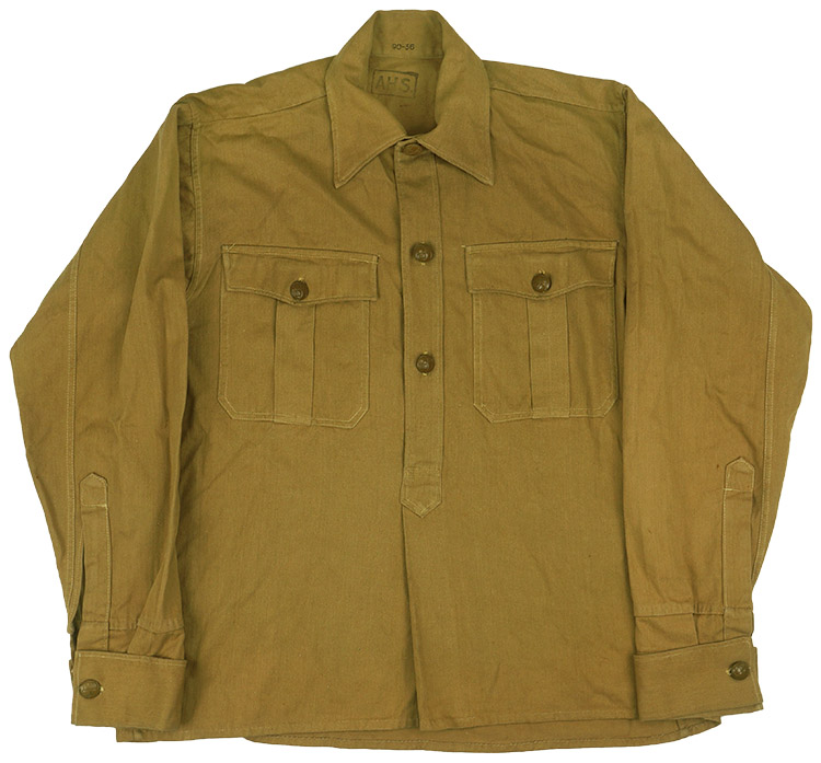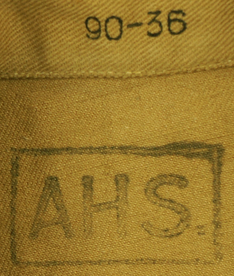 PHYSICAL DESCRIPTION: Tan-colored cotton twill, long-sleeved, three-quarter-length pull-over shirt with a three button front with a lay down collar. A pleated patch pocket with a scalloped button-down flap, is to each breast, as well as, fold-back, pleated French cuffs. The buttons to the cuffs, pockets and front closure are all of light brown bakelite, upon each of whose convex surfaces are four decorative divisions, simulating interwoven strips of leather which are all original to the shirt. The chest measures approximately 36". Also, stamped are the letters "AHS" in a box for "Adolf Hitler Schule".