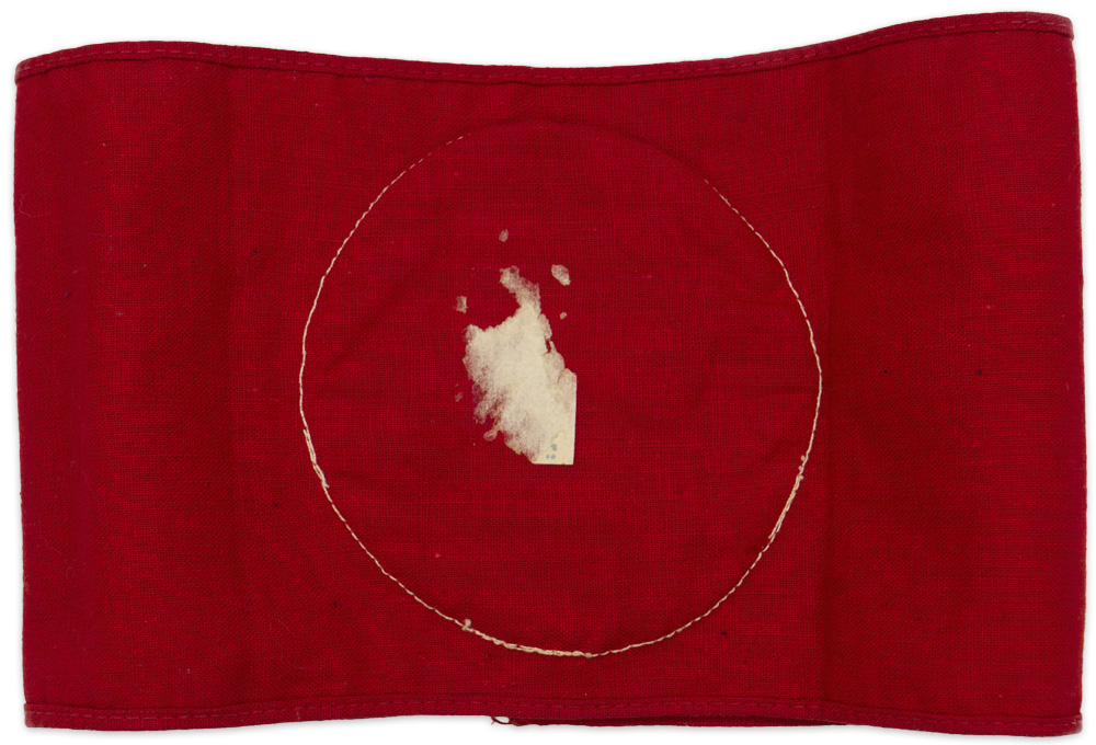 PHYSICAL DESCRIPTION: A red cotton armband, upon which is sewn an approximately 9cm diameter white disk, with a black machine woven mobile swastika. Shows the expected period use and wear but overall nice condition.