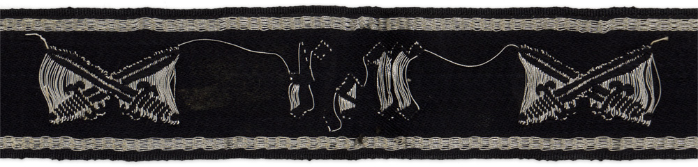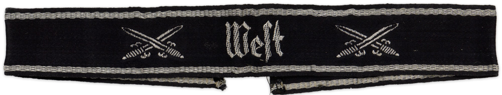 PHYSICAL DESCRIPTION: Machine woven "West" cufftitle in on a dark blue/black background with crossed swords to either side of the script. Bordered on both the top and button in silver wire threads. Cufftitle is full length an uncut. Leaders examples are much hard to find.