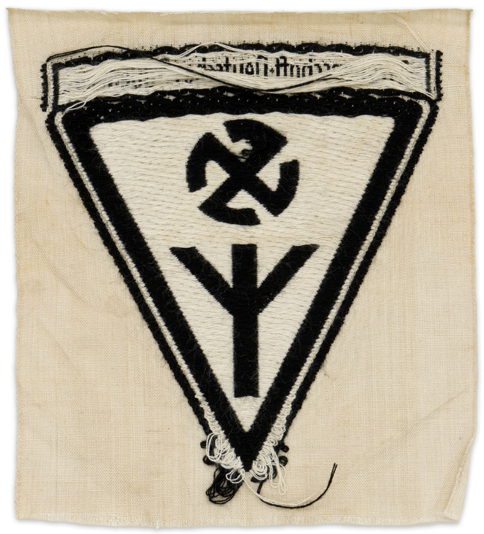 Machine woven inverted triangular sleeve badge roughly 10cm by 9cm. Badge feature a white life rune and sunwheel swastika on a black background with white and black outer border stripes. Top features a black horizontal bar with white script, NS Frauenschaft Deutsches Frauenwerk". Insignia still on white rayon factory roll.