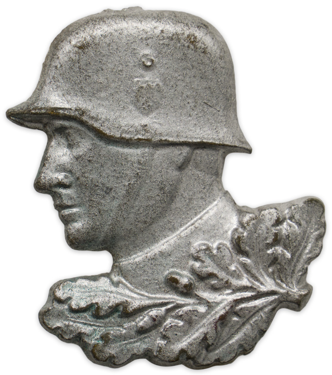 Cast protoplastic/bakelite badge which takes the form of the profiled head and neck of a soldier wearing an M35 helmet, with the national emblem plainly visible to its side, and with a spray of oak leaves to the base of the image. A vertical pin-back device is crimped to a plate glued to its unmarked reverse. Almost all of its original silver paint has been retained.