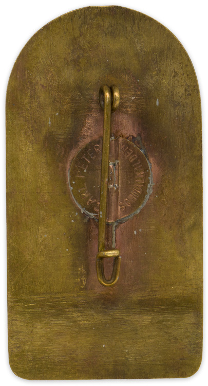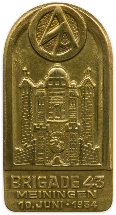 An approximately 50mm x 25mm, die cast alloy badge. The badge depicts an SA insignia above a castle scene. The bottom of the badge contains the embossed text, "Brigade 43 Meiningen 10. Juni. 1934.". Complete with pinback device and makers marked, "Carl Peter Schmalkalden".