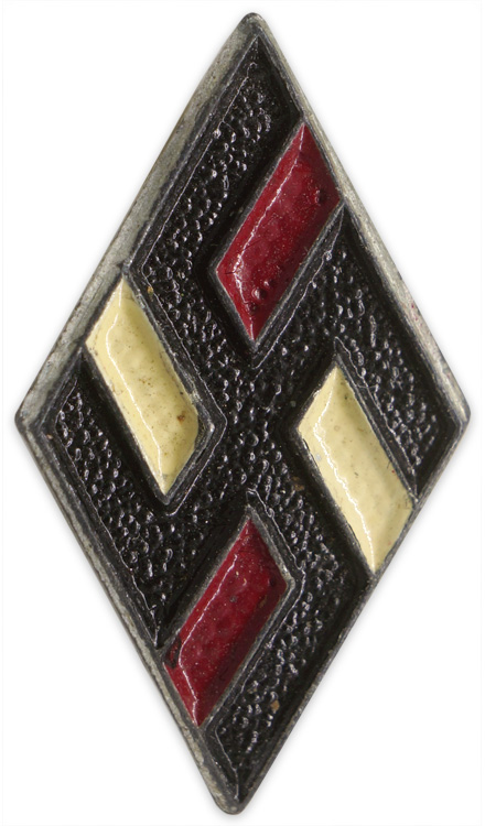 PHYSICAL DESCRIPTION: A cast alloy lapel pin, in the form of an elongated diamond, 23mm tall and 15mm wide, within which is a mobile swastika. Red, black and white paint work is all complete. A vertical pin-back device is to its reverse. Embossed RZM logo, and "M1/?,".is embossed near its other end. Nice example.
