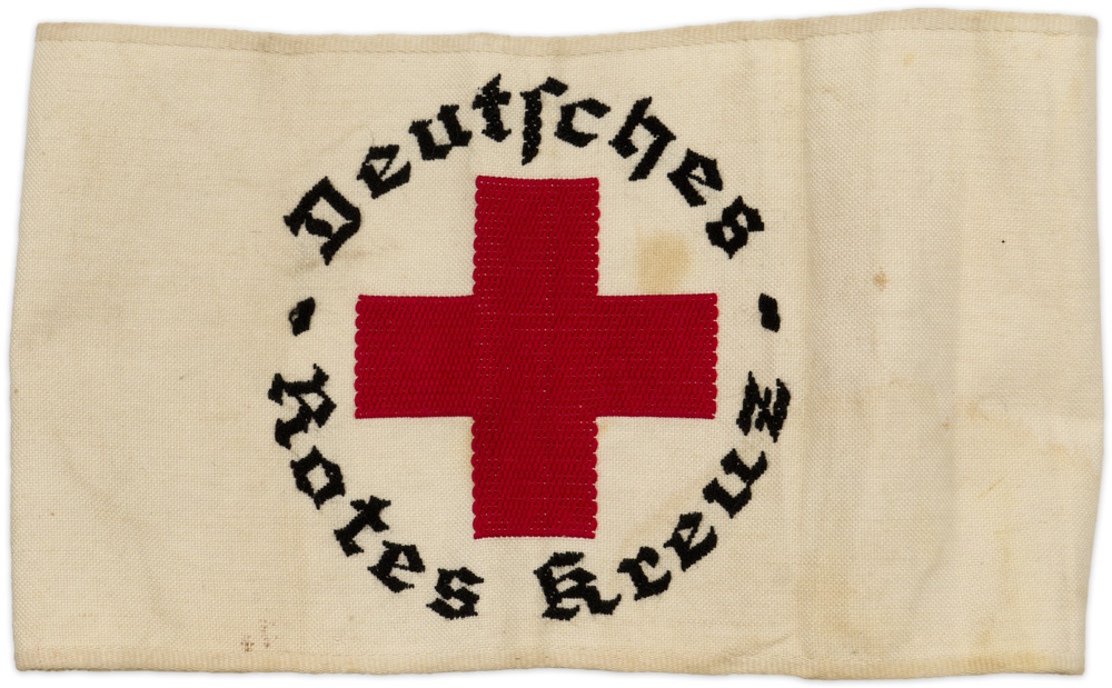 PHYSICAL DESCRIPTION: White cotton/rayon armband, upon which is machine woven a red Balkan cross, with "Deutsches Rotes Kreuz" scrolled around it in black Gothic script.